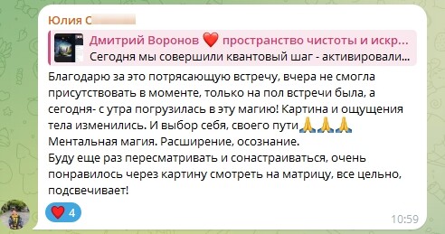 Если человек в своей матрице имеет 20 код судьбы, в момент работы в канале, начинается процесс позитивной трансформации, идёт исцеление рода и развитие интуиции;